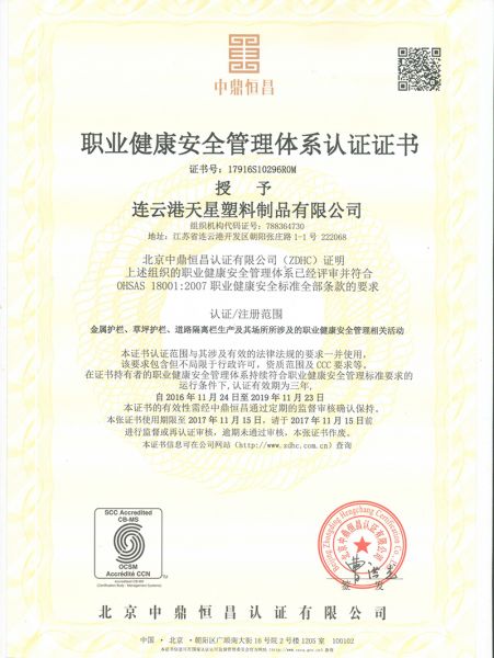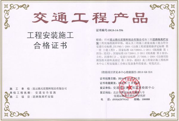 | 持证单位: 天星护栏(连云港天星塑料制品有限公司) |